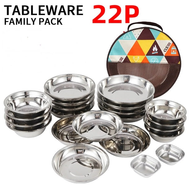 Durable stainless steel dinnerware set for camping & outdoor picnics, including plates, salad bowls, and food containers. Ideal for outdoor picnics and travel, offering a complete and reliable tableware solution.